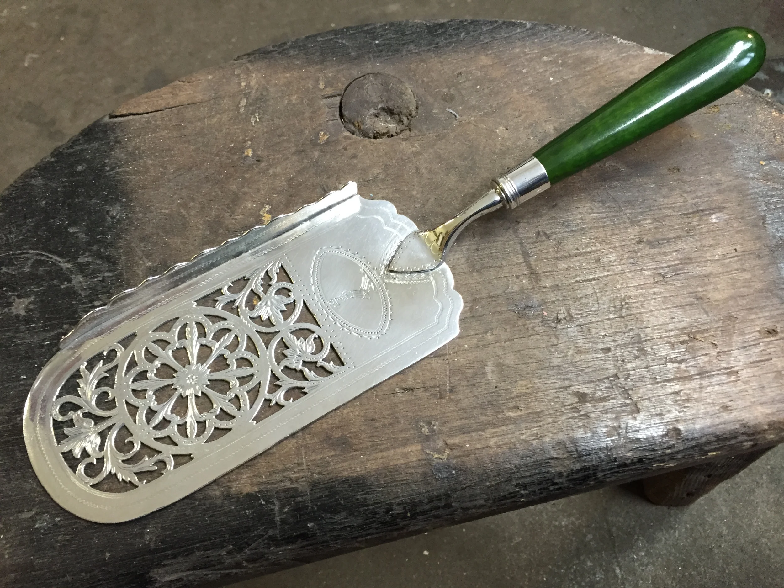 This last month has been a collection of designing for a number of different jobs and working through the various silver treasures, that come through the workshop for restoration. Below is a Robert Hennell Cake slice from 1856 that came in with a ruptured split in the blade and down both sides of the handle. Narrowing down the process to just two pictures, showing the before and after process, conveniently hides the many hours of frustrated toil. Not all pieces come together beautifully and seamlessly, but happily, it all worked out in the end
