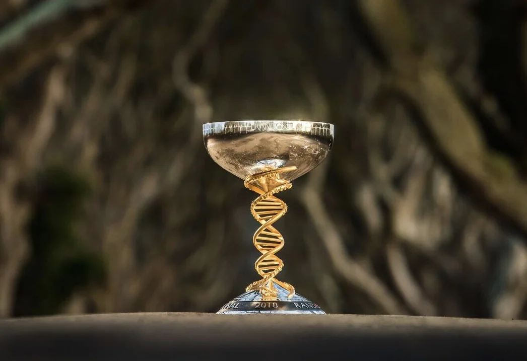 The stem is inspired by the DNA double helix. From a distance, I wanted it to look like a typical biological image, but upon closer inspection, you’ll see that the two outer DNA strands are covered with racing plates, as if they’re magnetized to the surface …. After visiting the Palace Museum in Newmarket, I was fascinated to hear that 95% of all modern thoroughbreds, can all be traced back to just one unbeaten champion in the 1700’s, so this detail pays homage to that. Also, horseshoes are of course a symbol of good luck and who wouldn’t want some of that.